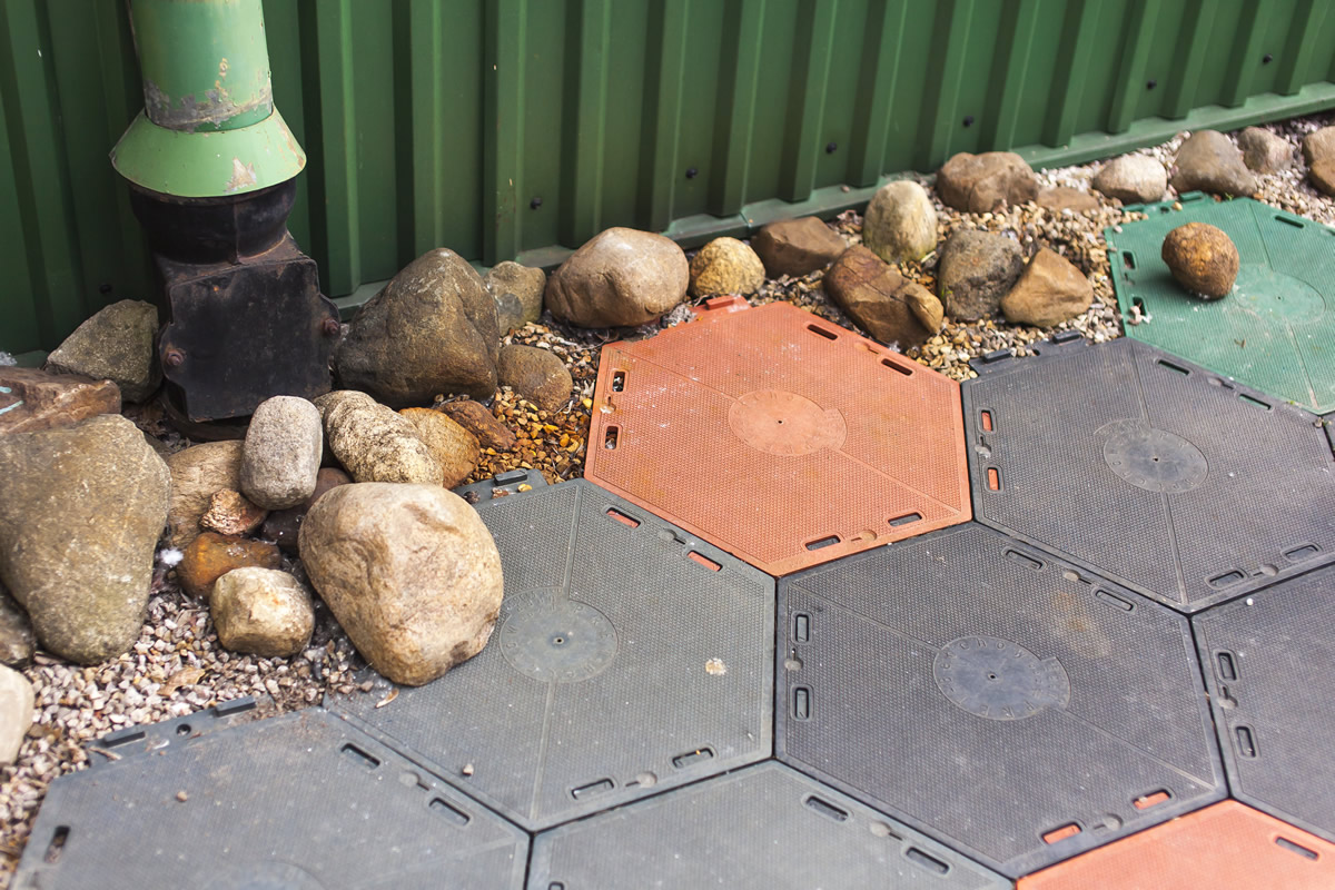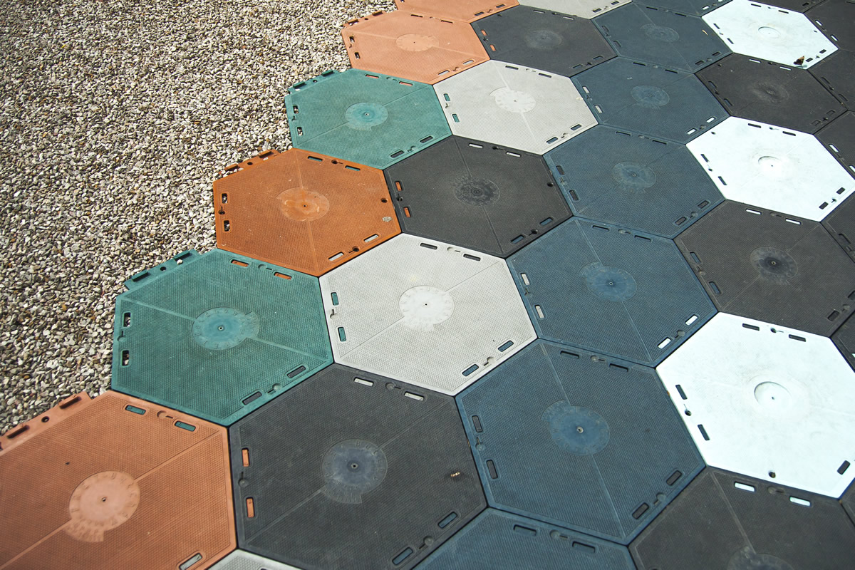 Die Platten bestehen aus Kunststoff und haben eine Sechseckform. Sie werden mit einem speziell entworfenen Schlosssystem miteinander verbunden. Dank der einzigartigen Struktur können wir auch bei Regen trockenen Fußes darüber gehen.